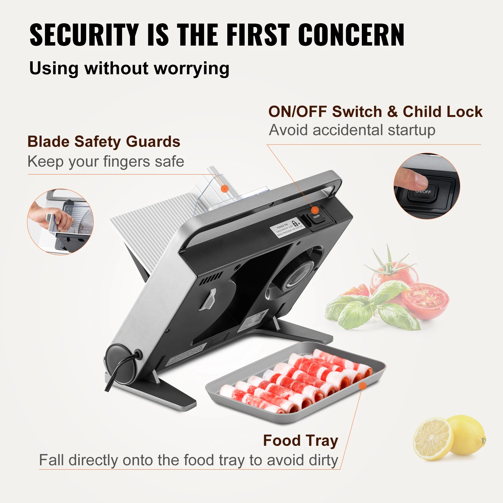 Security-Ensuring Designs: With a transparent shield for added security, our electric food slicer prevents unintentional contact with the blade. The ON/OFF switch and Child Lock feature provide additional safety, while nonslip rubber bottom feet ensure stability during operation.